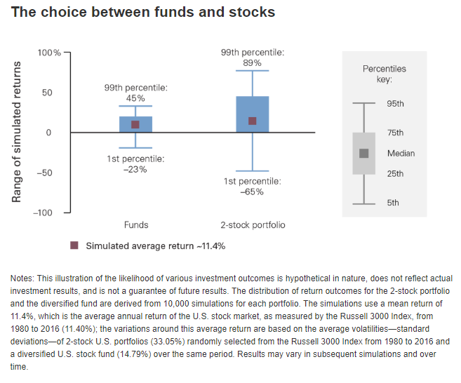 - l’un est très concentré, puisqu’il est constitué de 2 actions choisies aléatoirement au sein des valeurs composant l’indice Russell 3000[efn_note]Cet indice FTSE Russell est composé, comme son nom ne l’indique pas, des 4000 premières sociétés états-uniennes en termes de capitalisation, des plus grandes – megacaps – aux plus petites – microcaps.[/efn_note] (« 2-stock portfolio » dans l’infographie ci-dessus) ;