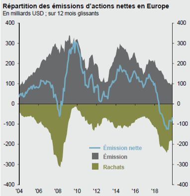 Et en Europe ? Le solde entre émissions et rachats d’actions est passé en territoire négatif. Les rachats d’actions avaient augmenté jusqu’à la crise financière de 2008-2009, qui les a ramenés à zéro. Ils ont repris à partir de 2015 pour dépasser récemment le montant des émissions d’actions.