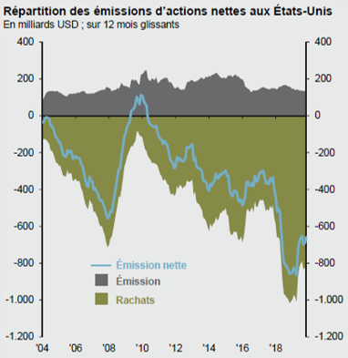 A fin 2019, il est d’environ -600 milliards de dollars sur 12 mois glissants, le montant des rachats d’actions s’élevant à 800 milliards de dollars.