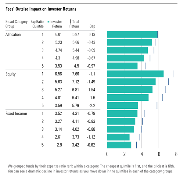 Morningstar a segmenté les familles de catégories en quintiles en fonction des frais. Le premier quintile comporte les 20% de fonds les moins chers, le deuxième quintile, les 20% suivants. Le cinquième quintile comporte les 20% de fonds les plus chers.