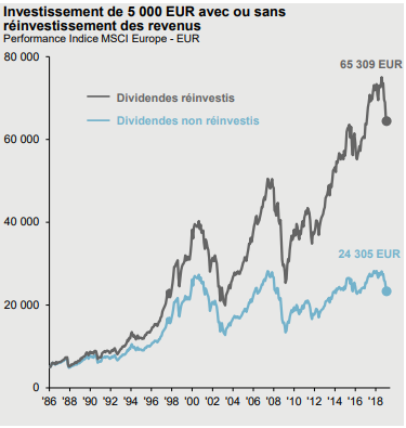 Le graphique compare l’évolution d’une somme de 5000 € investie en 1986 dans l’indice MSCI Europe : en bleu, la version prix (hors dividendes), en noir la version dividendes réinvestis. [efn_note]Avertissement : les performances du graphique sont données à titre illustratif seulement. Il n’est pas possible de les obtenir à l’identique : on peut s’exposer à la performance d’un indice via un fonds indiciel (classique ou ETF), mais la performance obtenue par l’investisseur sera différente de celle de l’indice pour différentes raisons (notamment à cause des frais facturés par le fonds).[/efn_note]