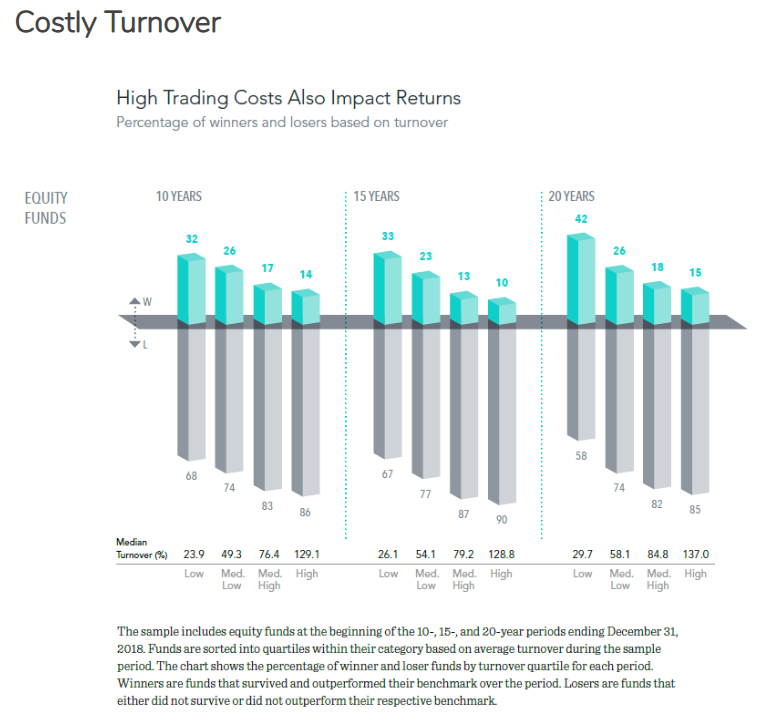 L’infographie montre clairement que, sur les trois durées d’analyse (10, 15 et 20 ans, de gauche à droite), plus le taux de rotation du portefeuille a été élevé, moins il y a eu de fonds gagnants.
