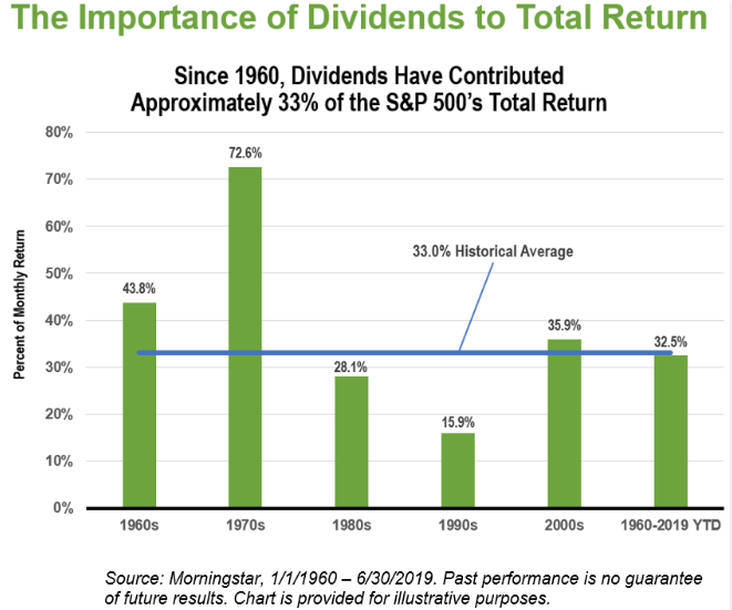 Pour l’indice S&P 500 des grandes capitalisations américaines, la contribution moyenne du réinvestissement des dividendes a été de 33% entre le 1er janvier 1960 et le 30 juin 2019.