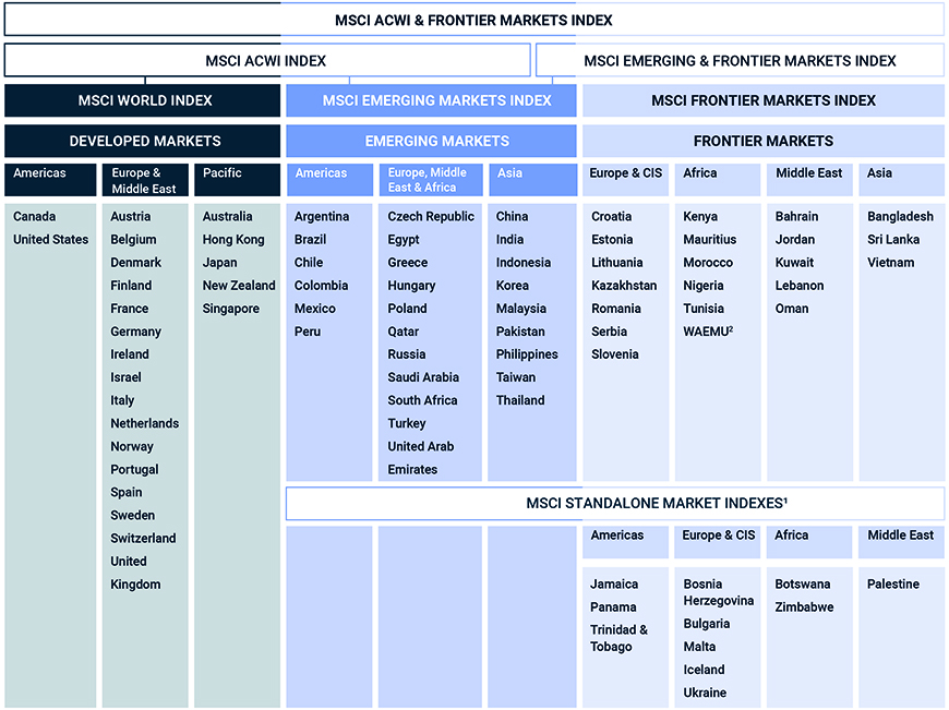 - le MSCI Emerging Markets and Frontier Markets Index regroupe le MSCI Emerging Markets et le MSCI Frontier Markets Index.