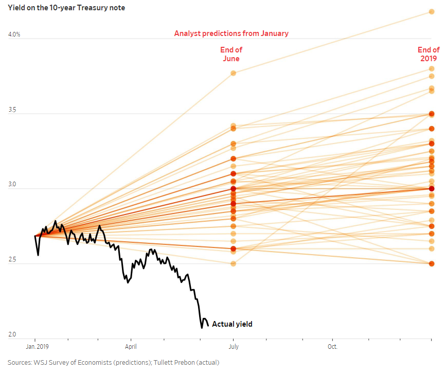 Le quotidien économique a comparé les prévisions de 50 « experts », des économistes, sur l’évolution du taux de l’obligation d’Etat à 10 ans émise par le gouvernement des Etats-Unis (le 10-year Treasury Note),[efn_note]Le 10-year Treasury Note est une des obligations les plus scrutées, les plus analysées au monde, par des myriades d’experts extrêmement qualifiés.[/efn_note] avec la réalité.