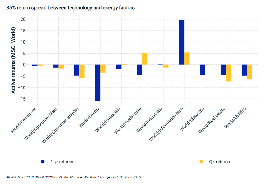 L’infographie ci-dessus indique la différence de performance entre le MSCI World et chacun des 11 secteurs (en bleu pour 2019, en orange pour le 4ème trimestre 2019).