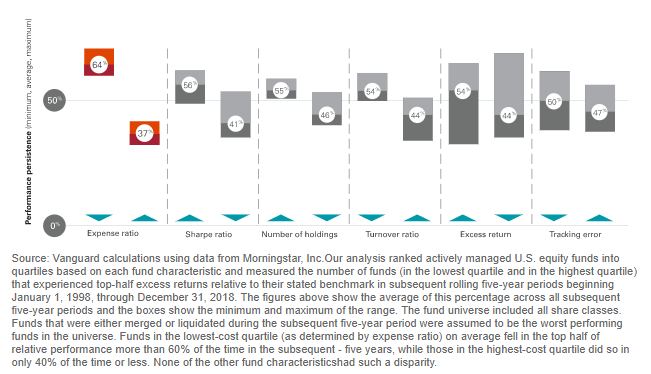 Vanguard s’est intéressé à différentes mesures (les frais – expense ratio -, le ratio de Sharpe – Sharpe ratio -, le nombre de titres en portefeuille – Number of holdings -, le taux de rotation du portefeuille, – Turnover ratio -, le rendement excédentaire – excess return – et l’écart de suivi – Tracking error) pour voir si elles avaient caractère prédictif en matière de performance future des fonds.
