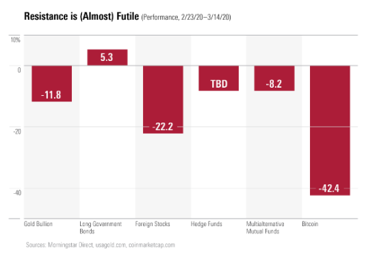 Il a sélectionné 6 placements, dont tous ne sont pas des valeurs refuges, et en a examiné la performance entre le 23 février et le 14 mars 2020, période durant laquelle l’indice S&P 500 des grandes valeurs étatsuniennes a baissé de 18,7%.